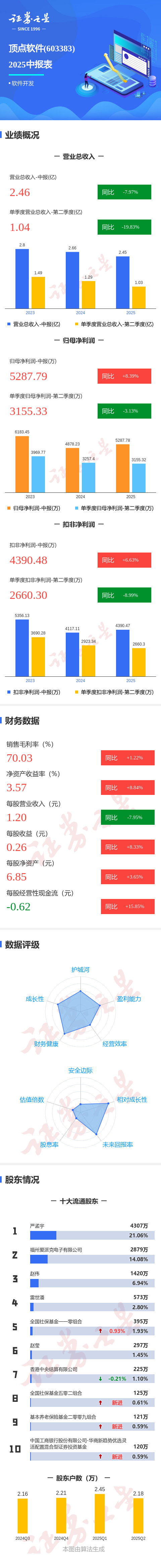 证券之星消息,顶点软件2025年中报显示,公司主营收入2.46亿元,同比下降7.97%;归母净利润5287.79万元,同比上升8.4%;扣非净利润4390.48万元,同比上升6.64%;其中2025年第二季度,公司单季度主营收入1.04亿元炒股杠杆平台哪个靠谱,同比下降19.83%;单季度归母净利润3155.33万元,同比下降3.13%;单季度扣非净利润2660.3万元,同比下降9.0%;负债率14.36%,投资收益198.04万元,财务费用-402.64万元,毛利率70.03%。