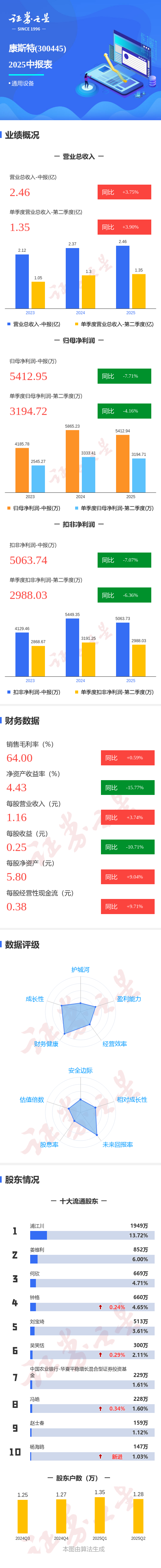 证券之星消息,康斯特2025年中报显示,公司主营收入2.46亿元,同比上升3.76%;归母净利润5412.95万元,同比下降7.71%;扣非净利润5063.74万元,同比下降7.08%;其中2025年第二季度,公司单季度主营收入1.35亿元,同比上升3.91%;单季度归母净利润3194.72万元,同比下降4.16%;单季度扣非净利润2988.03万元股票配资理财,同比下降6.37%;负债率8.19%,投资收益50.23万元,财务费用-139.74万元,毛利率64.0%。